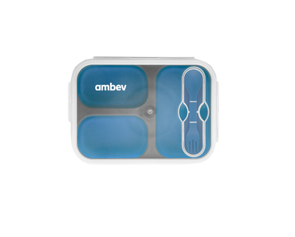 Marmita retrátil personalizada em Silicone e PP. Com 3 compartimentos e talher 2 em 1 (garfo e colher). Capacidade: 2 x 390 ml + 700 ml. Apta para micro-ondas (retirar a tampa). Food grade.