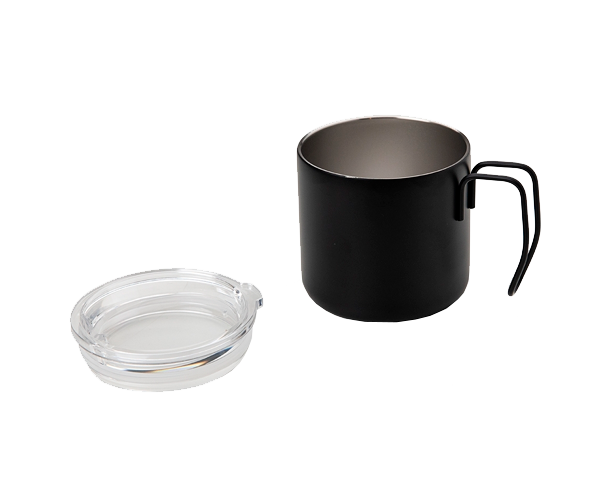 Caneca personalizada com capacidade de 350 ml parede dupla em Inox, com pegador de inox, contém tampa transparente com compartimento para beber.