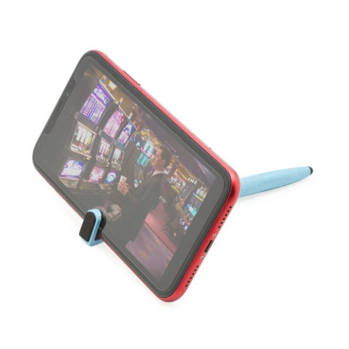 Caneta fibra de bambu touch com suporte para celular. Clip aberto utilizado como suporte para o celular e parte superior com limpador de tela. Aciona por giro, carga esferográfica na cor azul.