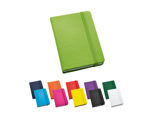 Caderno capa dura personalizado em material sintético com 80 folhas não pautadas.